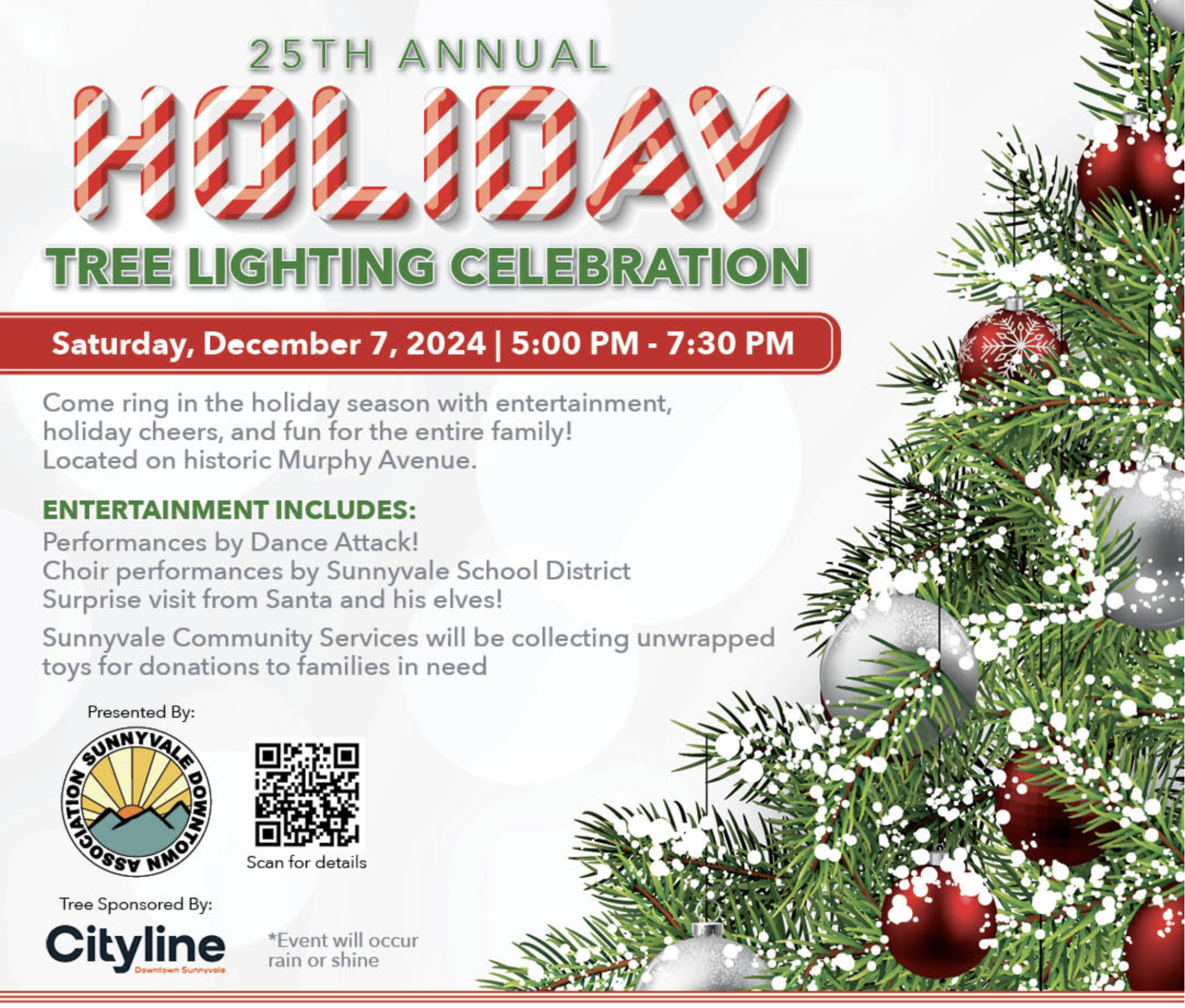 Come celebrate the season at Sunnyvale Downtown Association's 25th Annual Holiday Tree Lighting Celebration! Performances by Dance Attack!, Sunnyvale School District choirs, speeches from Mayor Larry Klein and more! With a surprise visit from the big guy in red! Sunnyvale Community Services will be accepting unwrapped toy donations to families in need.