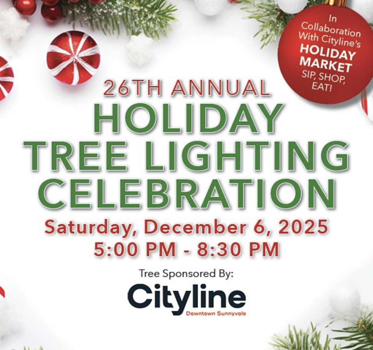 Our annual Holiday Tree Lighting Celebration is BACK! Join us for a free, family-friendly festive night of fun at Redwood Square in downtown Sunnyvale on December 6, from 5-8:30 PM, in collaboration with Cityline. ✨