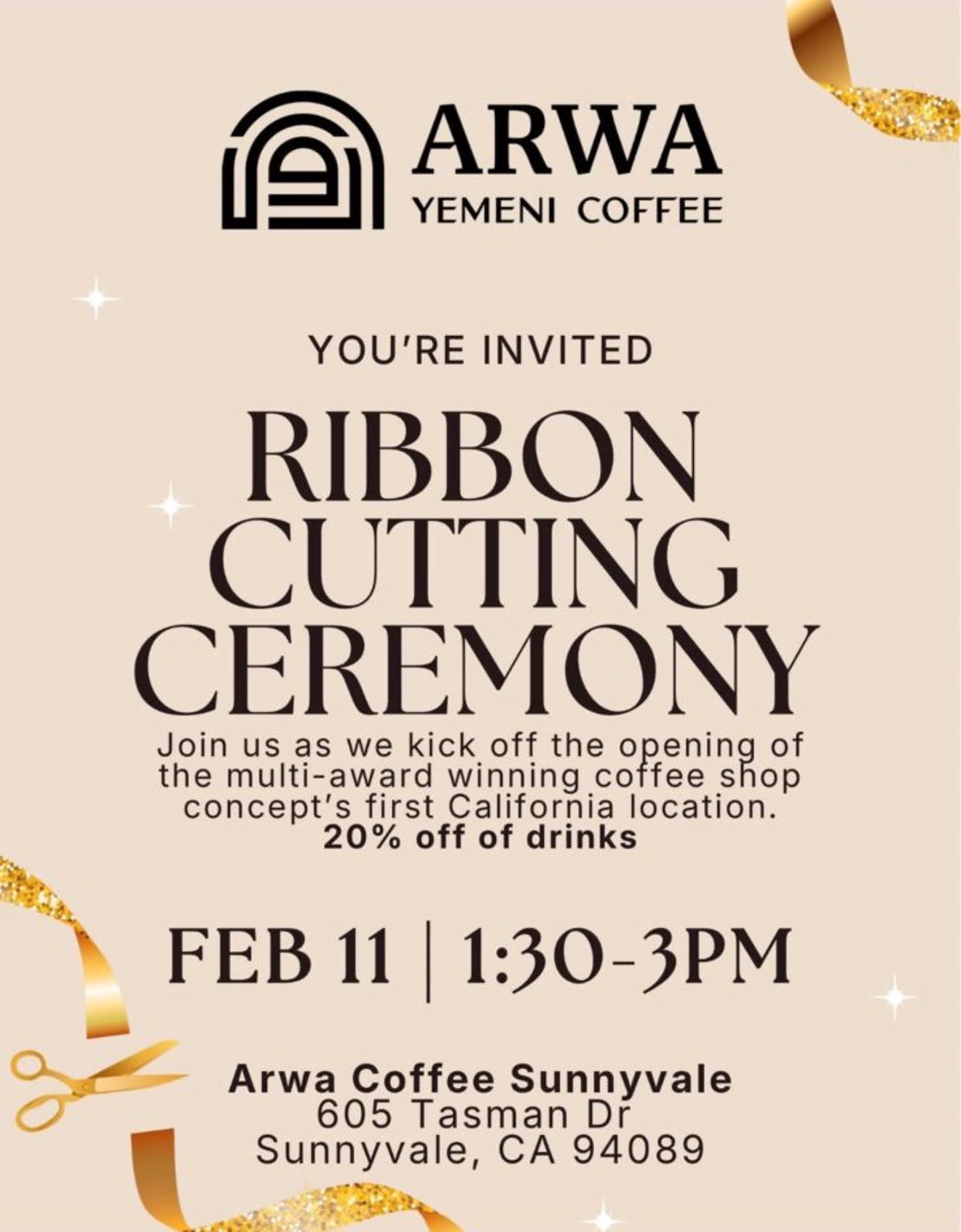 Join the Sunnyvale Chamber of Commerce as we celebrate Arwa Yemeni Coffee with an official Ribbon Cutting with Mayor Larry Klein!